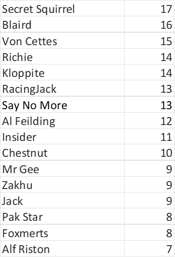 In the event of ties, the tie will be split by the entrant who picked the most Gallops winners (it is a racing site after all), then by the entrant who picked the most Football winners, then the most US sports winners.  If these don't split any ties we'll split the prizes in usual tie fashion.