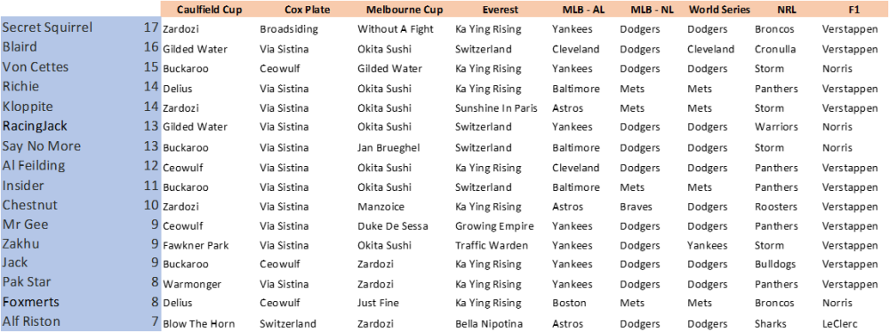 This comp is not for the faint hearted and will take a bit of work to compile your selections, but die hard sports fans should enjoy it.  You have to pick the winners of the various races and sporting events (listed below) that will take place across 2025.  1 point for each correct selection - most points wins.