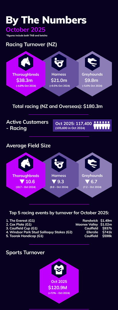 I read it as the amount bet on horse, harness and dog racing is down but the numbers betting are up and the sports betting (presumably rugby and football) is doing very well and the top turnover races are what you might expect in a month with the Everest, Cox Plate and Caulfield Cup but the Ellerslie race has done very well.