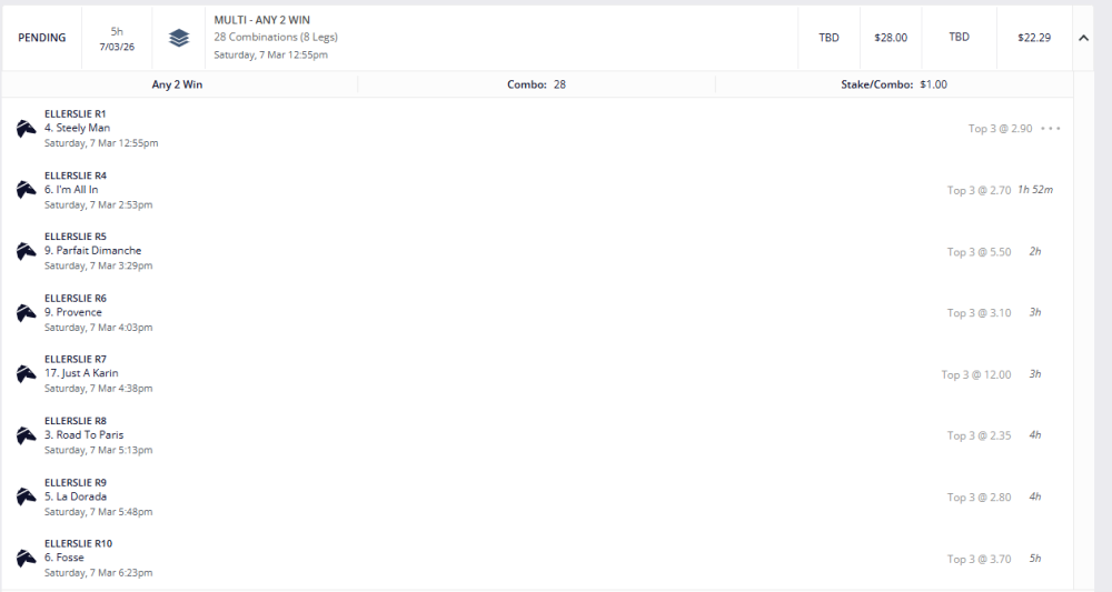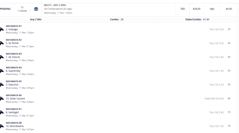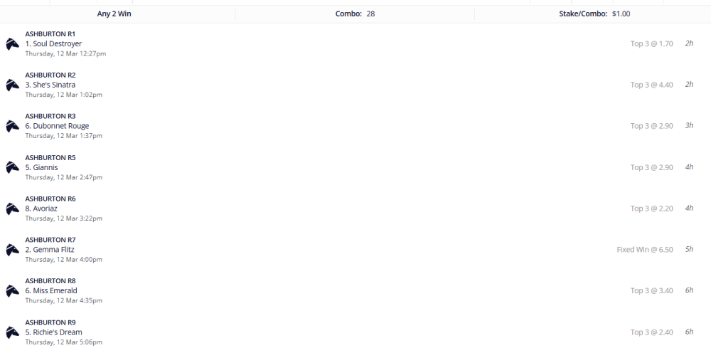 R8 Charms Star - Not my choice, but a friend knows a owner who told him it would win last start and it missed the jump as fav and ran a shocker so give it one more chance for my quad.
